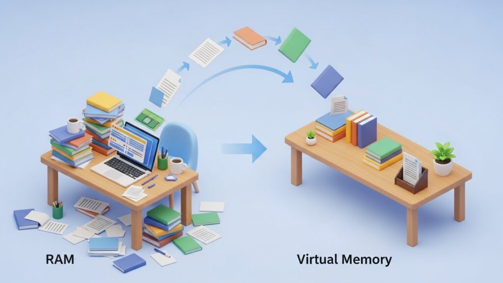 이때 옆에 있는 보조 테이블(하드디스크/SSD)을 잠시 책상처럼 쓰는 것, 이게 바로 ‘가상 메모리’입니다.