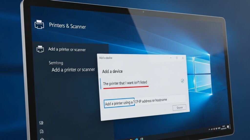 “원하는 프린터가 목록에 없습니다”라는 문구를 클릭해서 직접 주소를 넣는 게 가장 빠르고 정확해요.