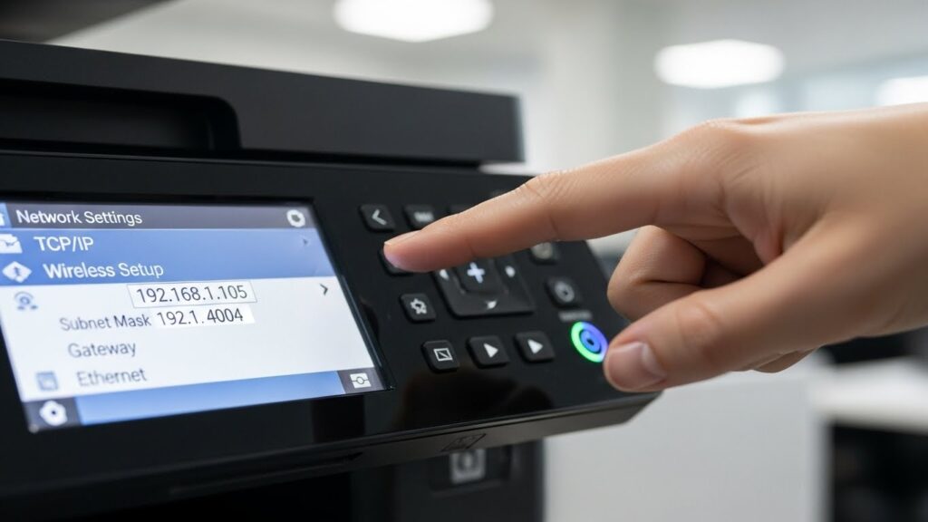 보통 프린터 설정 메뉴의 ‘네트워크 정보 확인’이나 ‘리포트 인쇄’를 누르면 192.168.x.x 형태의 주소가 나옵니다.