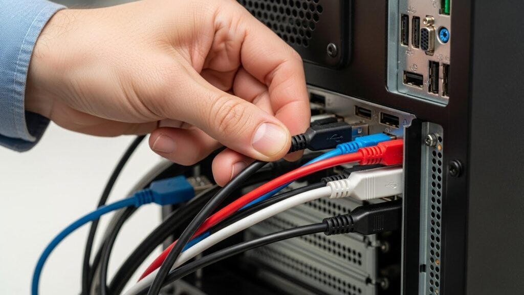 - 👉 모든 케이블 제거: 키보드, 마우스, 모니터 선을 제외한 모든 USB(프린터, 웹캠, 충전기 등)를 뽑아주세요.
