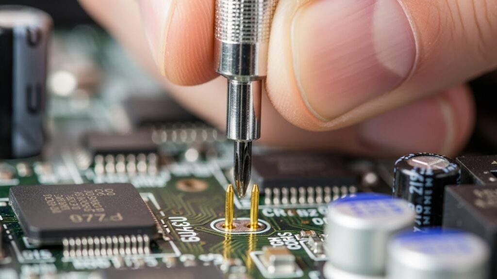 2. PW+, PW-라고 적힌 두 핀을 금속 드라이버로 살짝 접촉(쇼트)시킵니다.