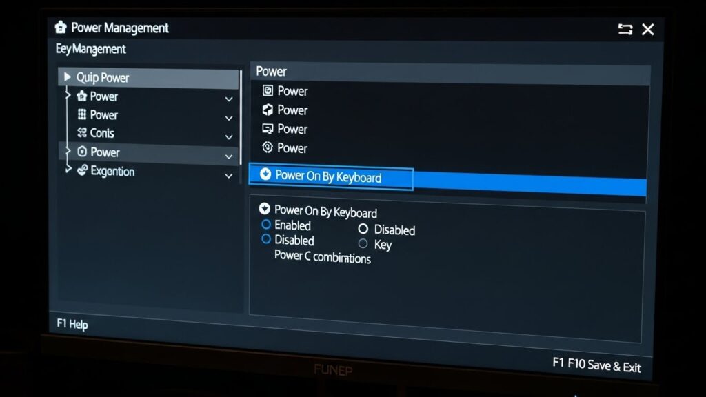 ‘Power Management’나 ‘Advanced’ 탭을 뒤져보면 ‘Power On By Keyboard’라는 항목이 보일 겁니다.
