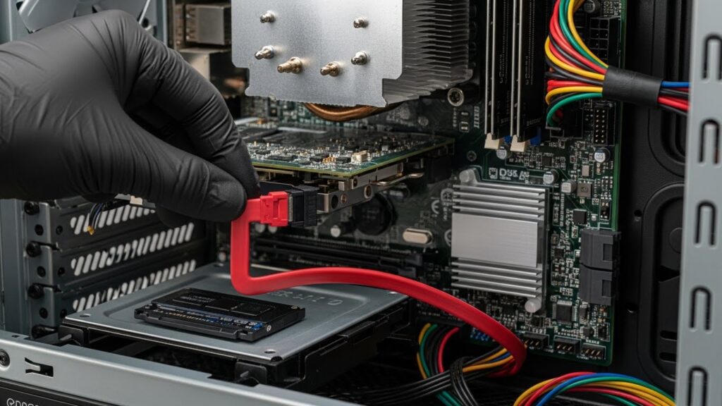 2. SSD나 하드디스크에 연결된 SATA 케이블(주로 빨간색이나 검은색 얇은 선)을 찾습니다.